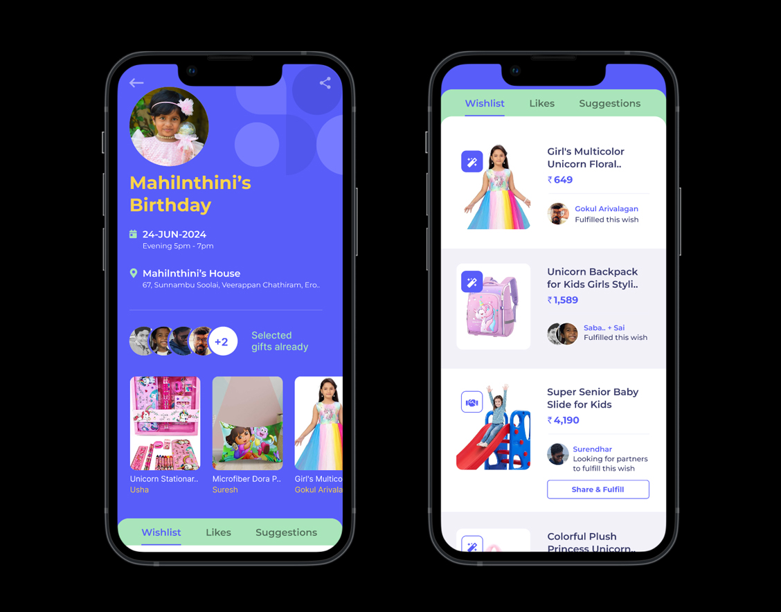 This app was designed with a playful yet elegant interface to enhance the joy of gifting. Users can easily create and share personalized wishlists, while friends and family can surprise them with meaningful gifts—making giving more social, thoughtful, and fun.