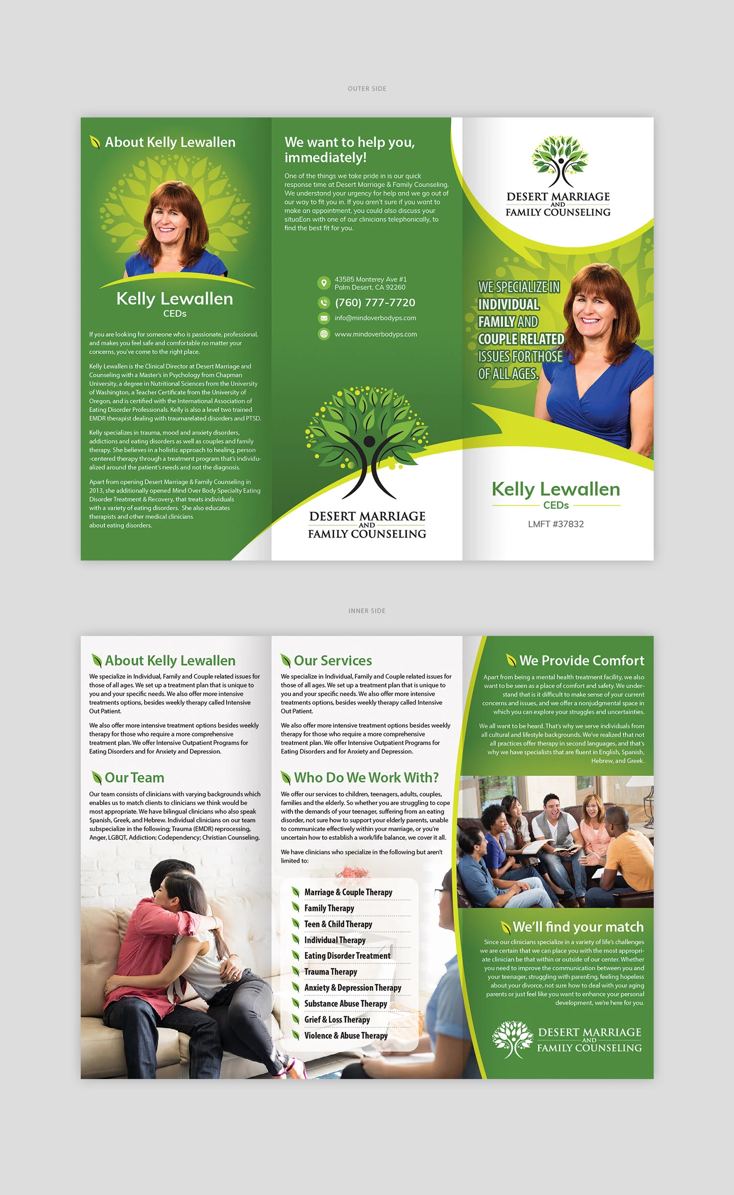This brochure was designed with a calming layout and soft tones to reflect the supportive nature of therapy. It highlights personalized counseling for individuals, couples, and families of all ages, with custom treatment plans tailored to each client's unique needs.