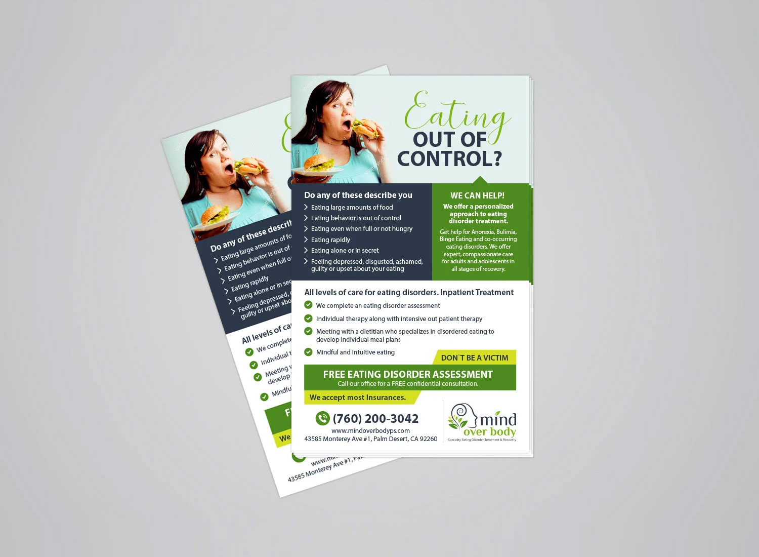 This brochure was designed to reflect the center's expert, compassionate care. Using a clean layout, calming colors, and clear messaging, it highlights support for Anorexia, Bulimia, Binge-Eating, and Co-Occurring Disorders, guiding all ages through their recovery journey.