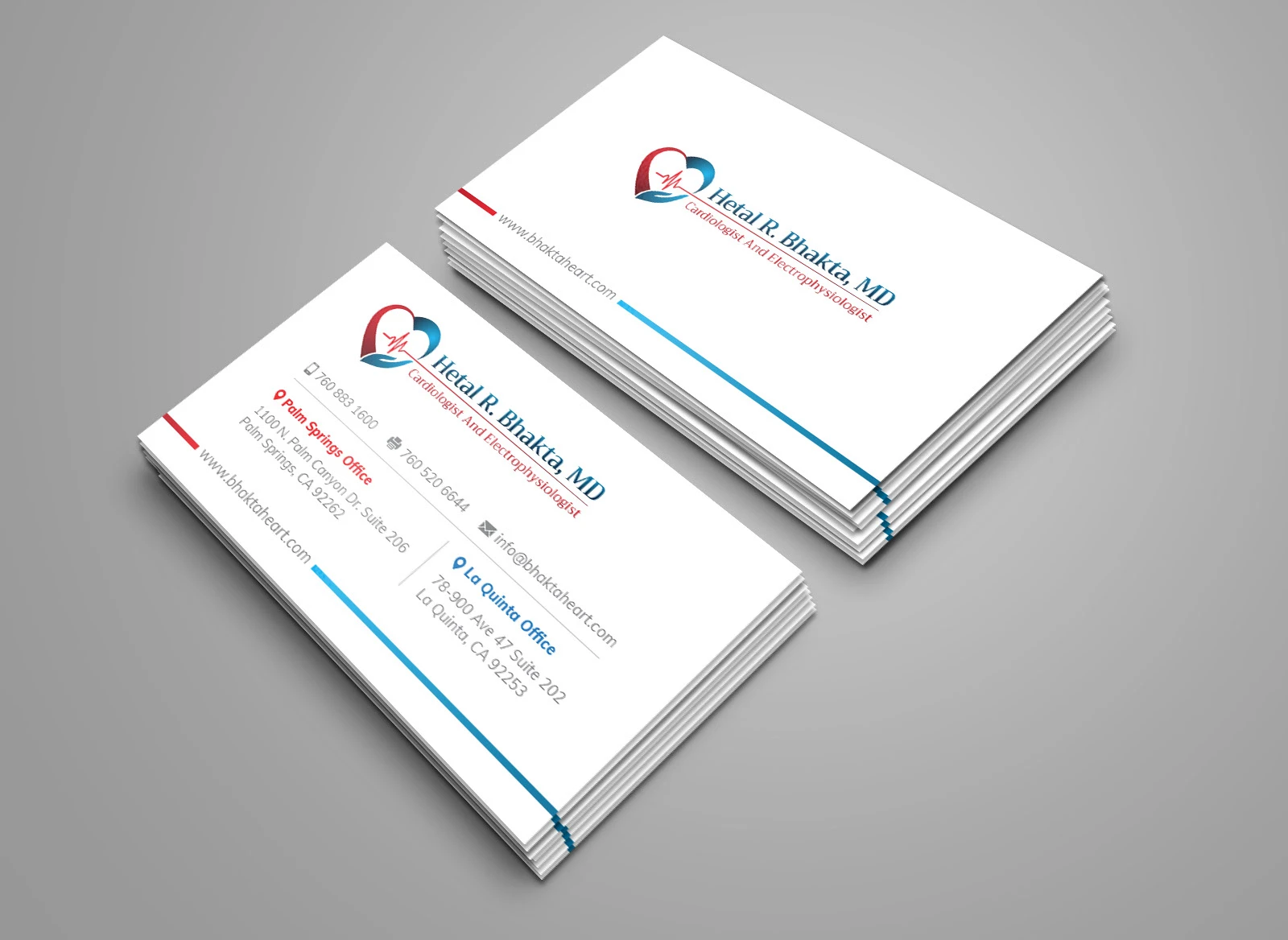 This business card was designed to reflect Dr. Hetal Bhakta's national reputation and clinical excellence. With a modern, clean layout and subtle medical-themed elements, it highlights his cardiology and electrophysiology expertise and dual locations in Palm Springs and La Quinta.