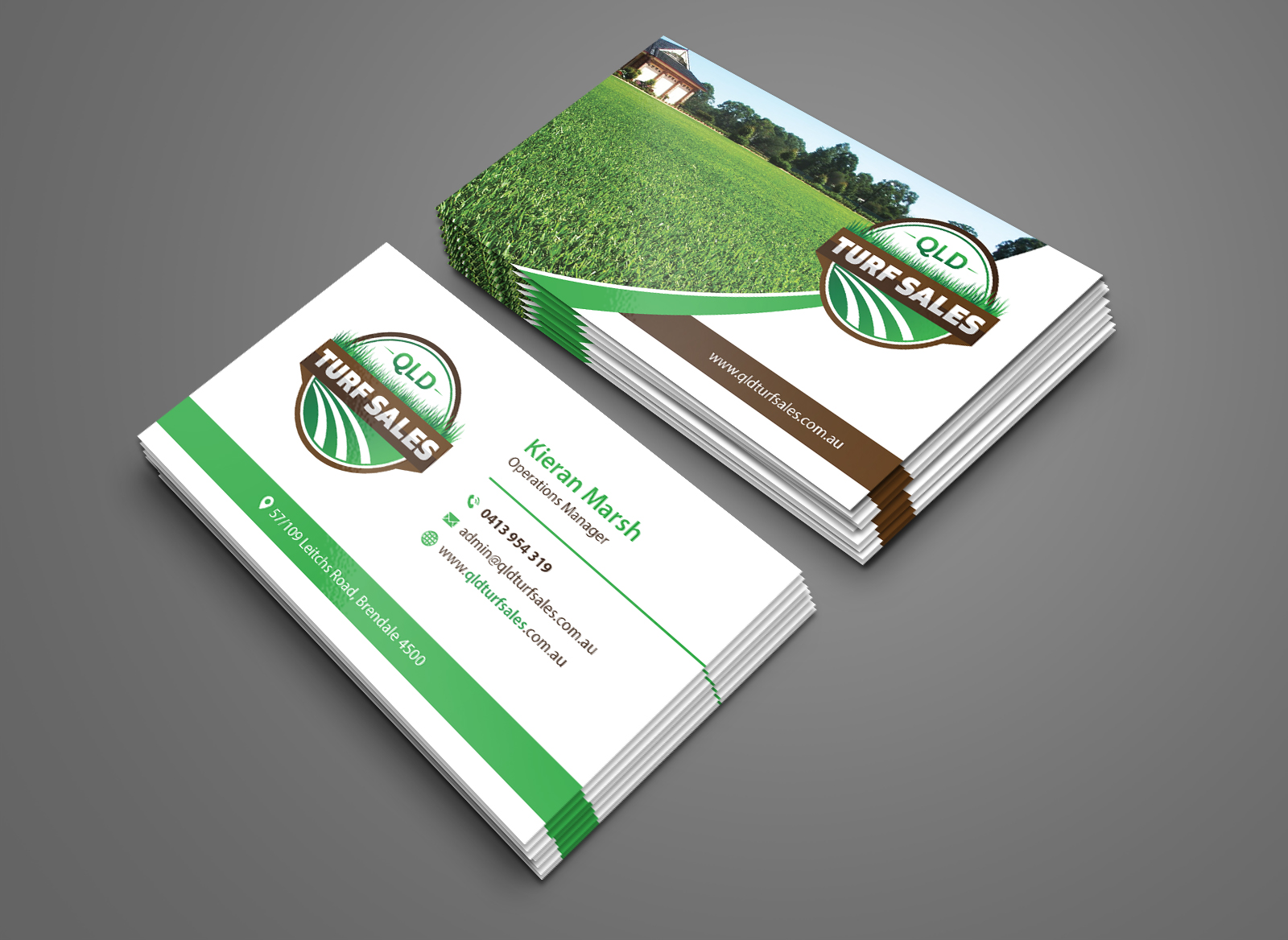 This business card was crafted with a clean, modern design to reflect QLD's expertise in premium turf solutions. Using earthy greens and sleek typography, it highlights their specialization in natural and artificial turf for residential, commercial, and sports landscapes.