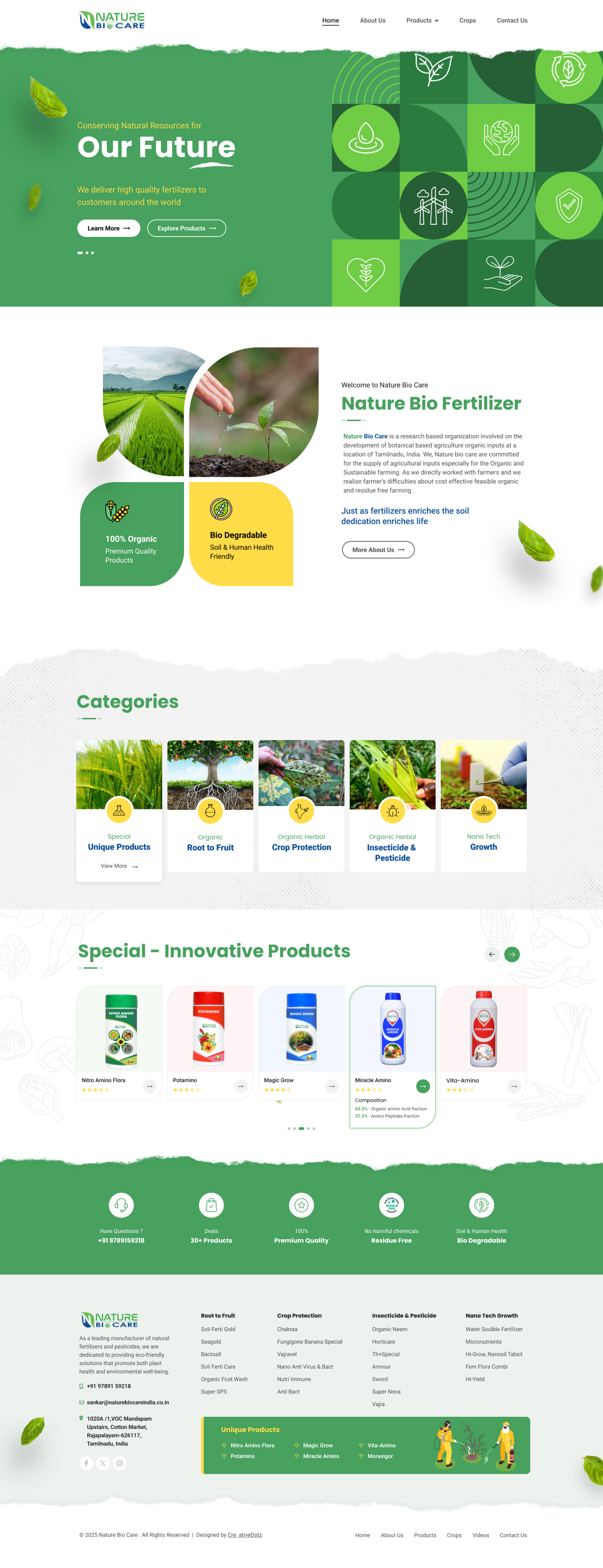 The website for Nature Bio Care is designed with a clean, earthy UI reflecting its focus on organic agriculture. Using natural tones, botanical imagery, and intuitive layout, it highlights the brand's commitment to research-based organic inputs and sustainable farming in Tamil Nadu.
