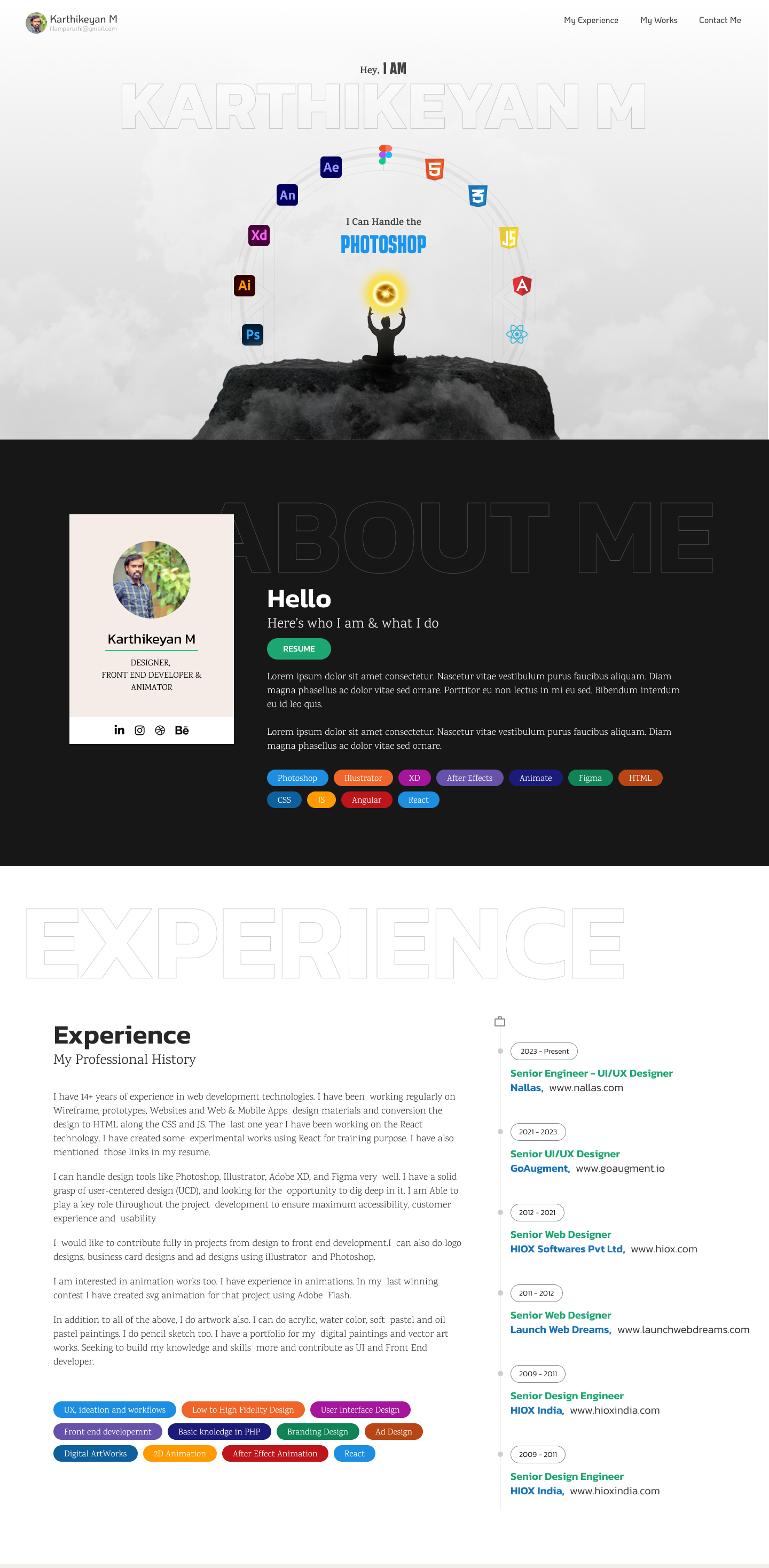 This portfolio features a conceptual hero banner of a yogic man atop a mountain—symbolizing the developer's mastery over tech tools. Designed in Figma, enhanced with Photoshop & Illustrator, and animated using Typed.js and AOS.js for a dynamic, immersive experience.